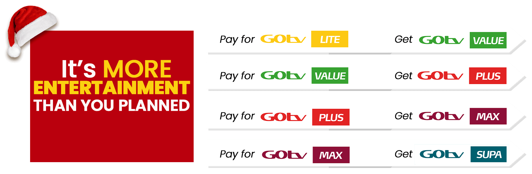GOtv customers are in for a treat this holiday season! Simply renew your subscription before it expires and get upgraded to a higher package for Free. From 19 December - 24 January, 2023 GOtv Subscribers will enjoy so much more entertainment! At NO Extra Cost.