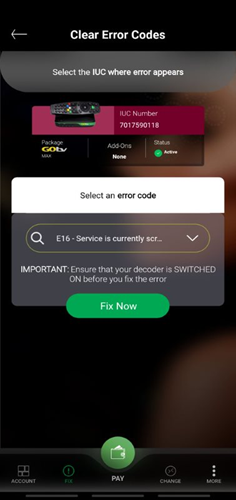 An E16 error can be prevented by making the correct payment for your subscription and ensuring your decoder is powered on when you make the payment.